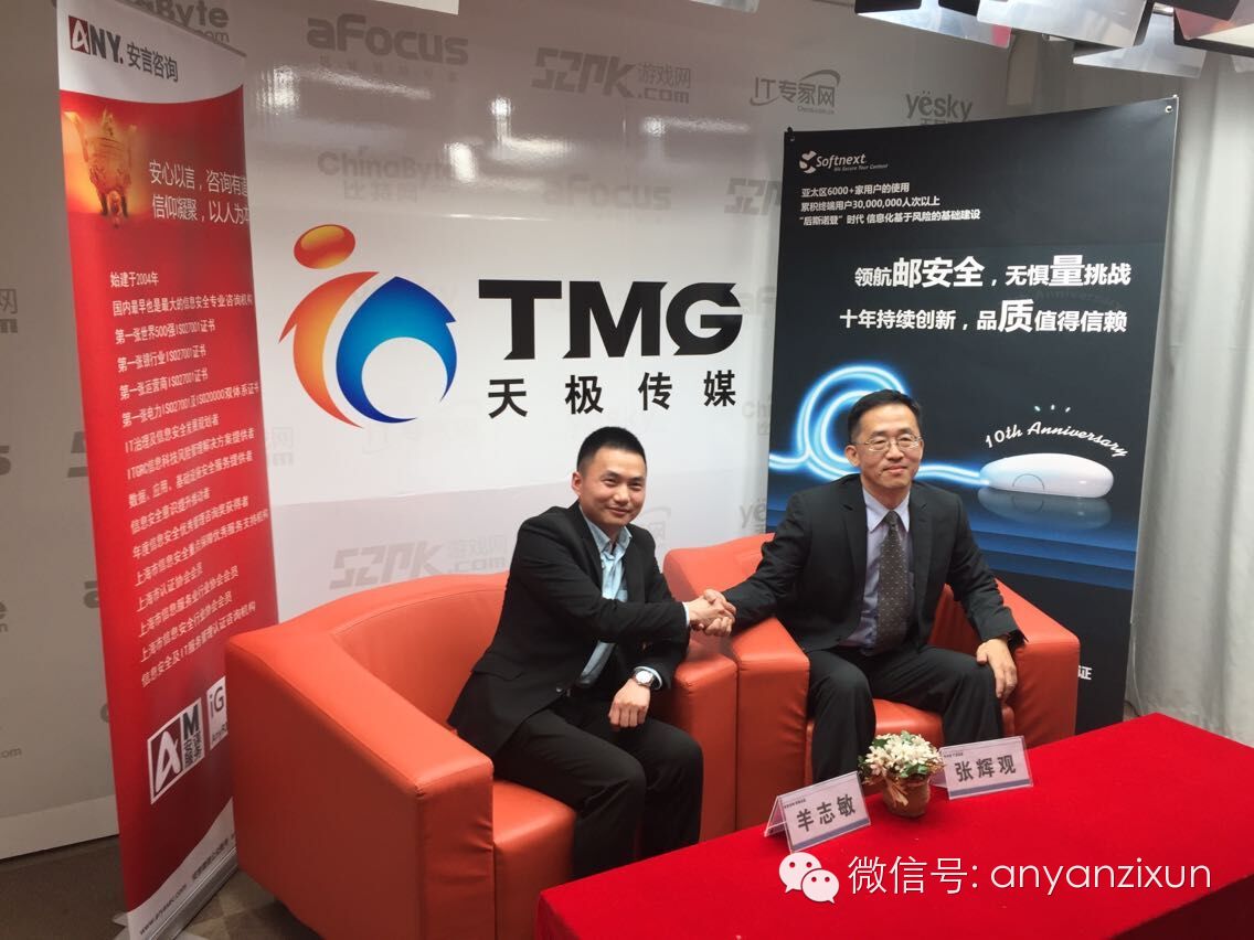 上海安言信息技术有限公司咨询总监羊志敏先生(左)和Softnext守内安信息科技(上海)有限公司产品总监张辉观先生(右)正在接受采访