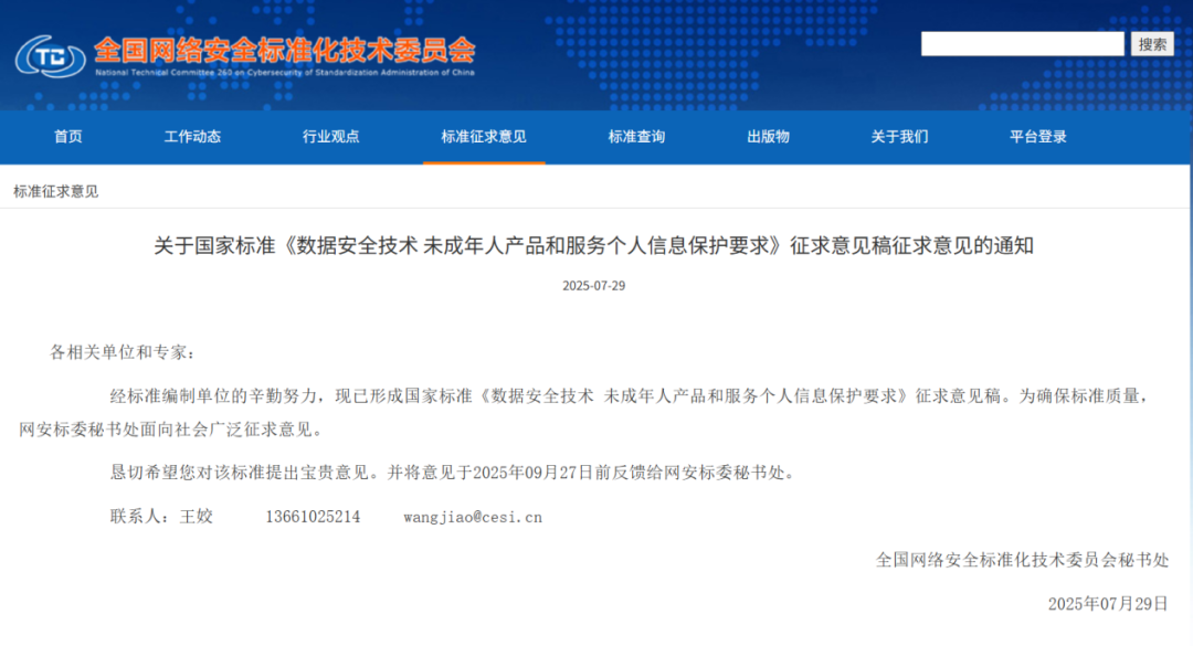 5. TC260发布《数据安全技术 未成年人产品和服务个人信息保护要求》征求意见稿