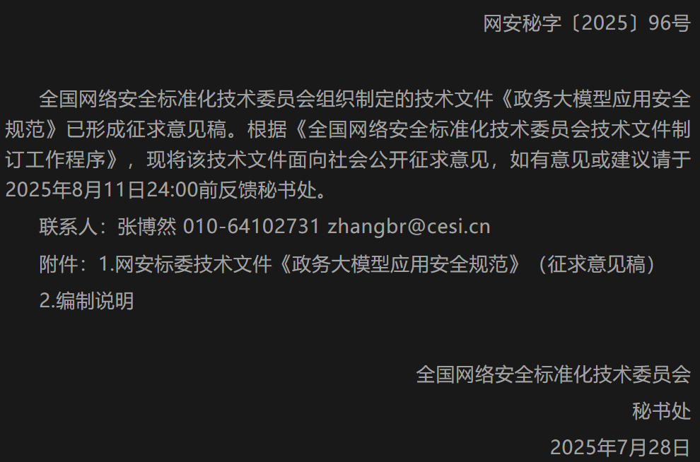 4. 《政务大模型应用安全规范》(征求意见稿)公开征求意见